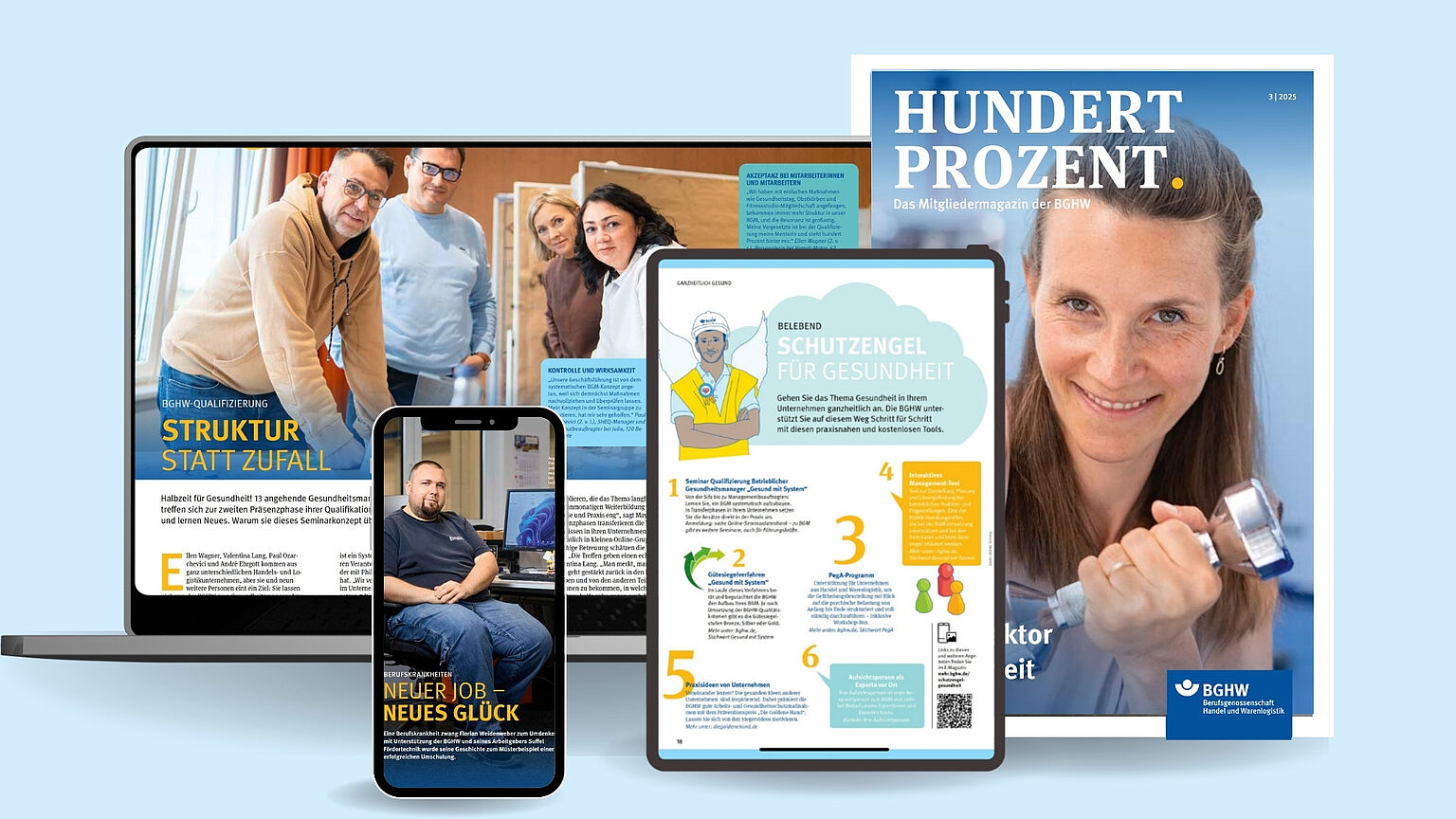 In unserem E-Magazin HUNDERT PROZENT dreht sich alles um Sicherheit und Gesundheit bei der Arbeit – exklusive Reportagen und Interviews bieten Ihnen spannende Einblicke in die moderne Arbeitswelt und geben Ihnen gute und hilfreiche Tipps für Präventionsmaßnahmen.