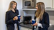 Kaffeepause heißt bei uns nicht selten: Eispause! Dann gerne auf unserer 50 Meter langen Dachterrasse. Von hier aus blickt man selbst an Tagen mit "nordischem Wetter" bis zum berühmten Bremer Dom. Die Arbeit am Bildschirm unterbrechen wir hin und wieder für eine Bewegte Pause in unserem Sportraum. Und für die Mittagspause liegen die vielfältigen Möglichkeiten direkt vor der Tür.