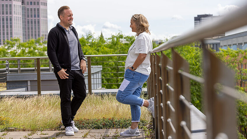 Zur Pause treffen wir uns in unserem begrünten Innenhof, wo auch unsere zugelaufene Hauskatze ihr Lager hat – oder auf unserer Dachterrasse mit imposantem Blick über die Ruhrstadt, die heute zu den "grünsten Städten" Deutschlands gehört.
