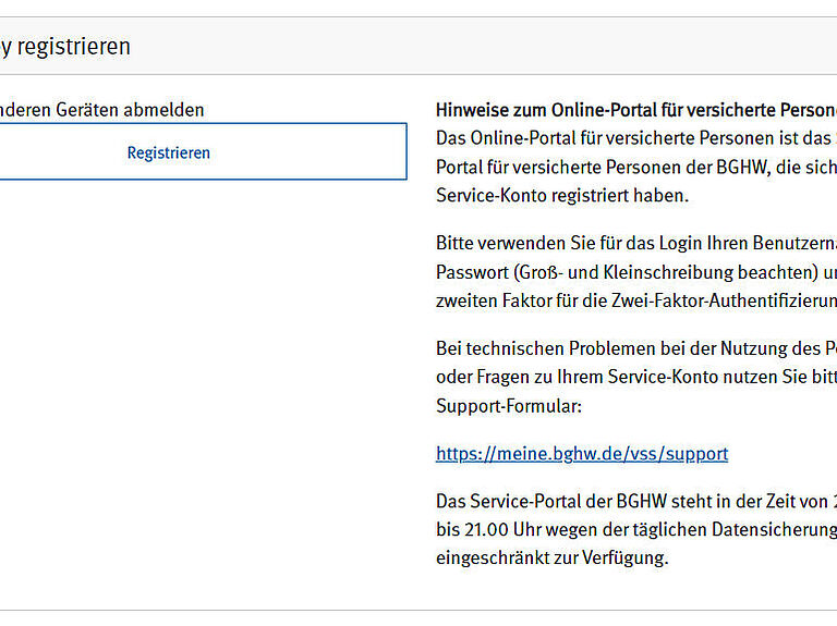 Sofern Ihnen der eingerichtete Passkey nicht mehr zur Verfügung steht, informieren Sie uns bitte über unser Supportformular: meine.bghw.de/vss/support, damit wir den Passkey von unserer Seite löschen können. Im Anschluss können Sie bei der Anmeldung an Ihr Konto einen zweiten Faktor wieder neu einrichten.