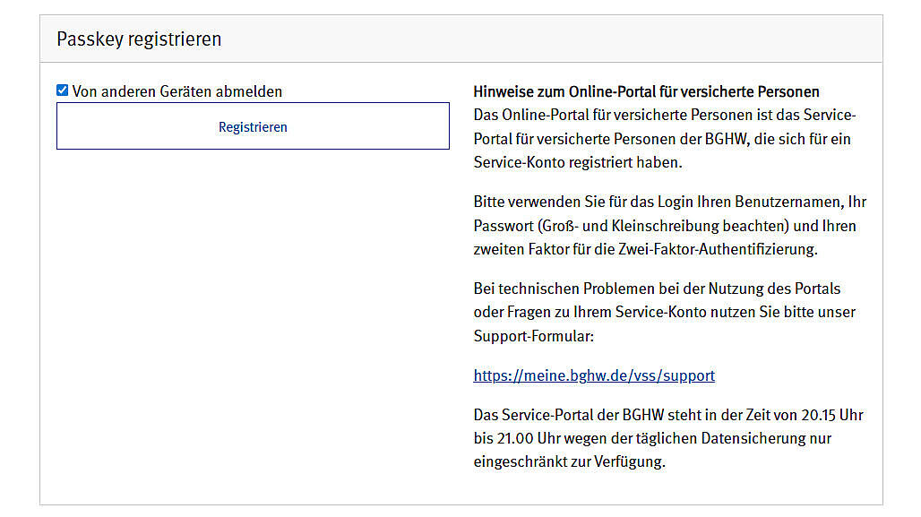 Was mache ich, wenn ich mein Gerät, auf dem ich Passkey eingerichtet habe, nicht mehr nutzen kann bzw. verloren habe? Sofern Ihnen der eingerichtete Passkey nicht mehr zur Verfügung steht, informieren Sie uns bitte über unser Supportformular: meine.bghw.de/vss/support, damit wir den Passkey von unserer Seite löschen können. Im Anschluss können Sie bei der Anmeldung an Ihr Konto einen zweiten Faktor wieder neu einrichten.