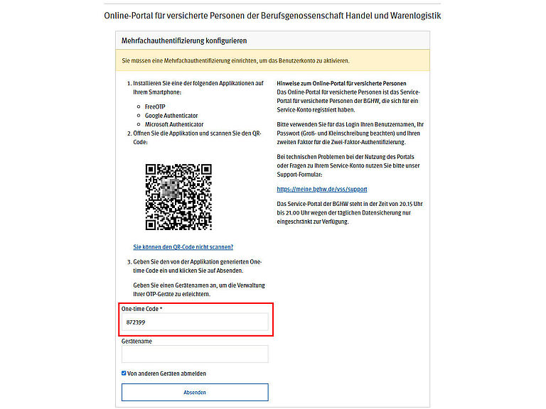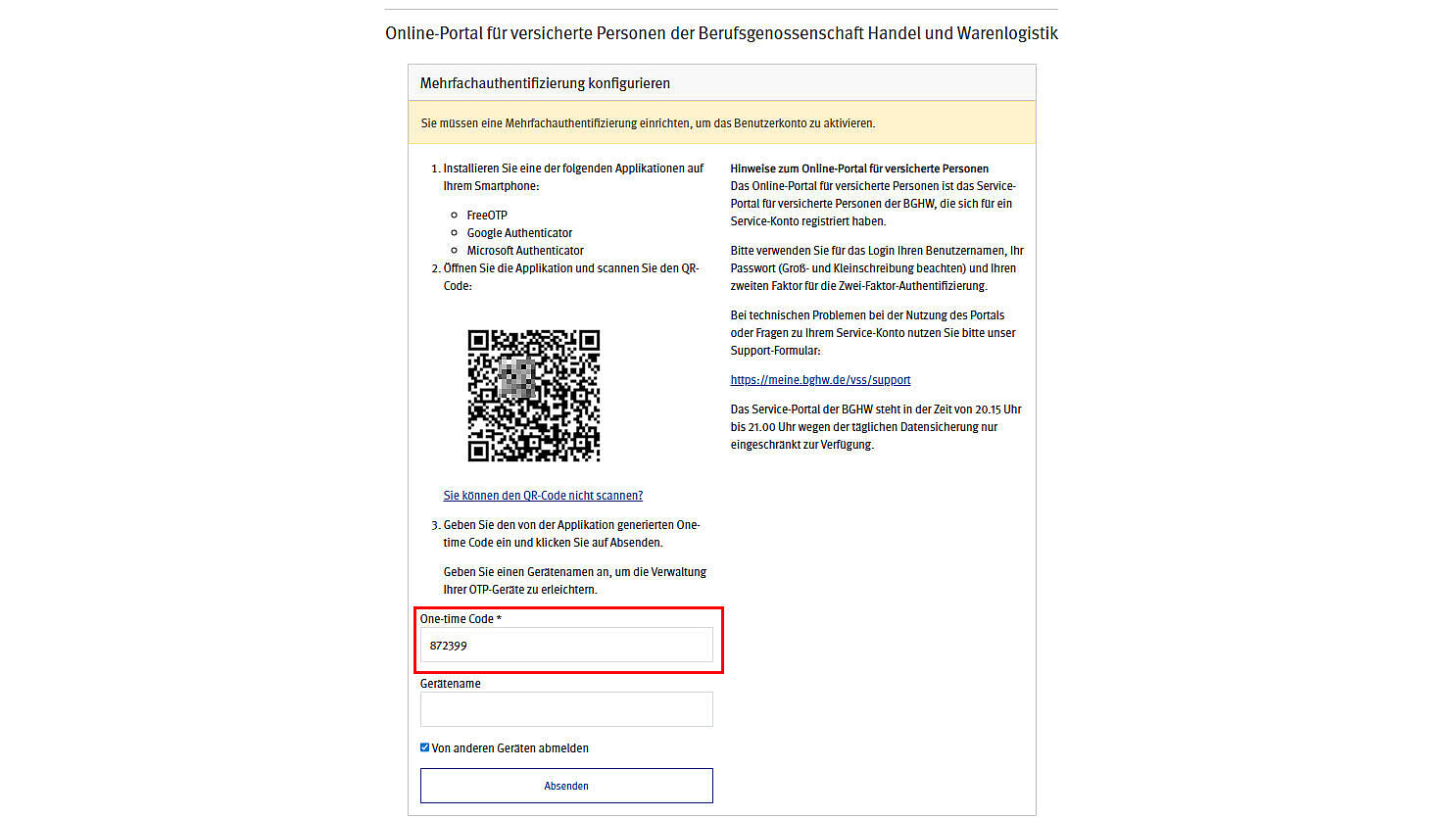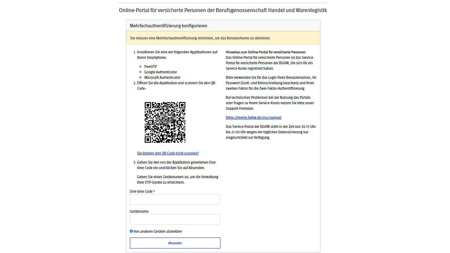 Ich habe keinen Zugriff mehr auf das Gerät, auf dem ich die Anmeldung mit dem zweiten Faktor (TOTP) eingerichtet habe. Sofern Ihnen der zweite Faktor nicht mehr zur Verfügung steht, teilen Sie uns das bitte unter Verwendung unseres Supportformulars https://meine.bghw.de/vss/support mit.